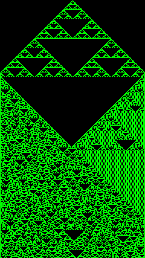 With setting a tile at the top corner, we can see that the fractal produces confused and hardly understandable patterns of triangles which looks random in nature.